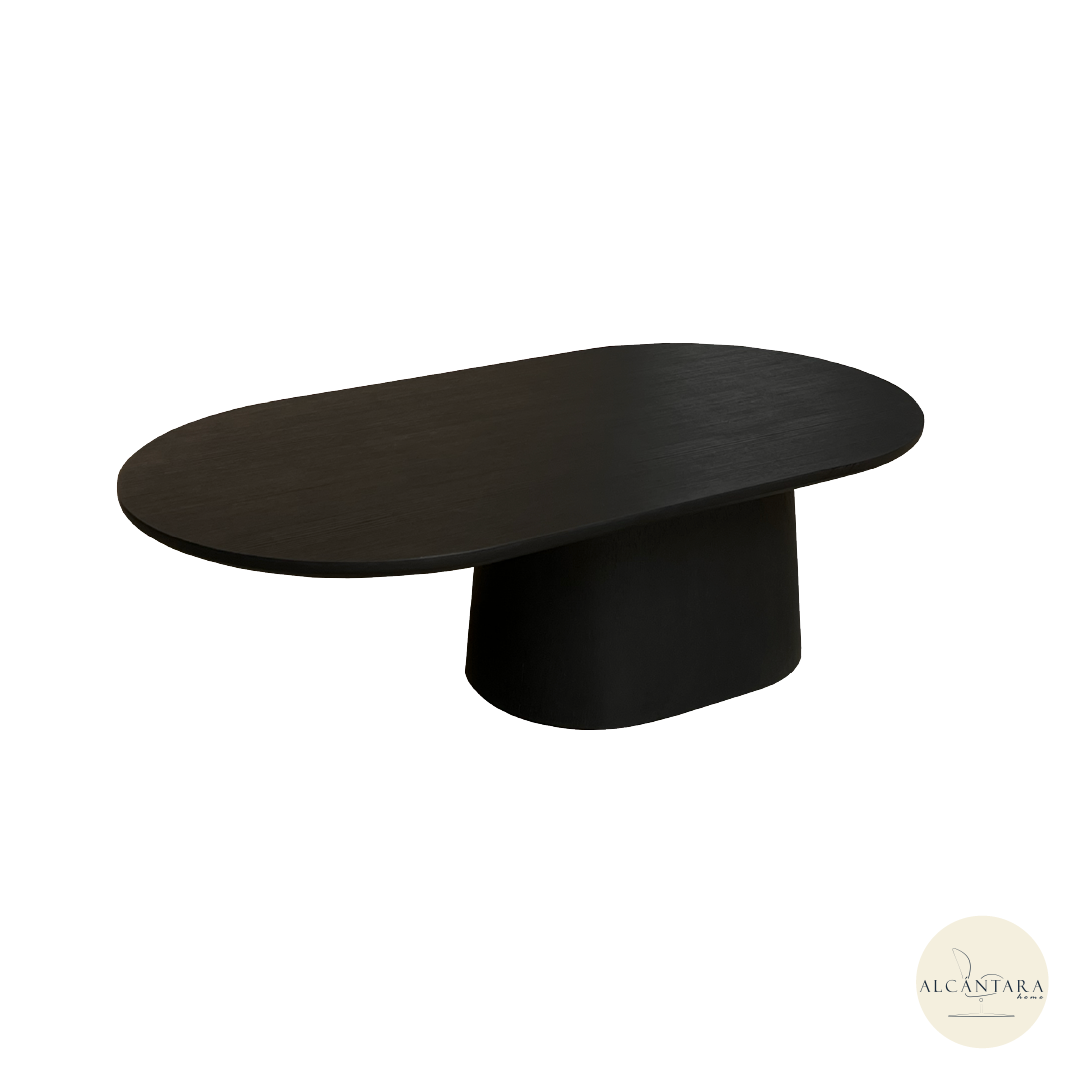 La mesa Noctis está hecha de base de MDF, la cual aporta solidez y estabilidad, mientras que el tablero, también en MDF enchapado en fórmica, resalta con un acabado en acrílico tono negro poro abierto que deja entrever la textura natural de la madera. La silueta ovalada y la base central de líneas suaves transmiten elegancia y carácter.